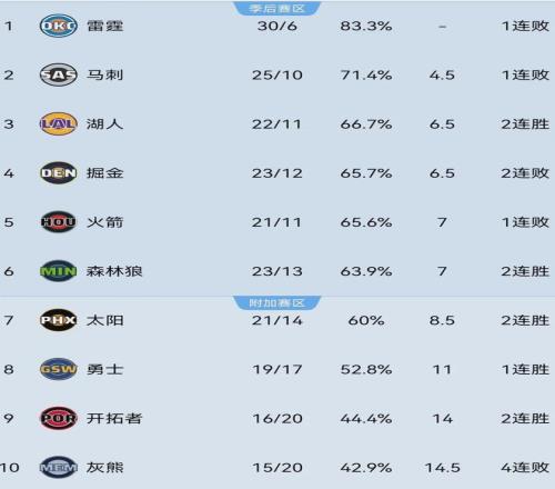 當(dāng)前西部前三甲分別是30勝6負(fù)的雷霆、25勝10負(fù)的馬刺,以及22勝11負(fù)的湖人,遭遇嚴(yán)重傷病潮的掘金則以23勝12負(fù)位列西部第四。