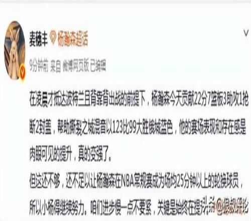 媒體人“麥穗豐”發(fā)文點(diǎn)評(píng):在凌晨才抵達(dá)波特蘭且背靠背出戰(zhàn)的前提下,楊瀚森今天貢獻(xiàn)22分7籃板3助攻1搶斷2封蓋,幫助撕裂之城混音以123比99大勝俄城藍(lán)色,他的賽場(chǎng)表現(xiàn)和存在感是肉眼可見(jiàn)的提升,真的變強(qiáng)了。