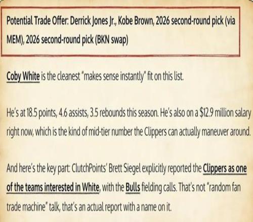 美媒《Fadeaway World》撰文建議,快船可以將小瓊斯、科比·布朗、2026年的次輪簽(來自灰熊)、2026年的次輪簽(籃網(wǎng)互換)打包送到公牛,換回后衛(wèi)科比·懷特。