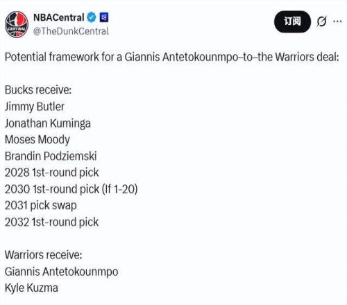 勇士已聯(lián)系雄鹿,愿意送出除庫里外所有資產(chǎn)。無論字母哥傷勢如何以及回歸時間表是否明確,這一意向都不會改變。雄鹿隊記Nehm列出了雙方8換2交易的潛在框架。勇士送出巴特勒、庫明加、穆迪、波杰姆斯基、2028年首輪選秀權(quán)、2030年首輪選秀權(quán)(如果順位在1-20)、2032年首輪選秀權(quán)、2031年選秀權(quán)互換資格,從雄鹿換來字母哥和庫茲馬。